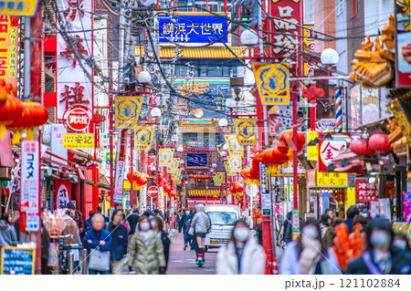 日本の横浜都市景観 師走。横浜中華街・関帝廟通りなどを望む。奥は「天長門」や横浜大世界=12日