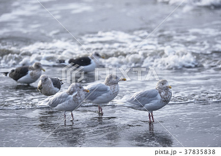 波打ち際でカモメたちの群れに混じって羽を休めているシロカモメ