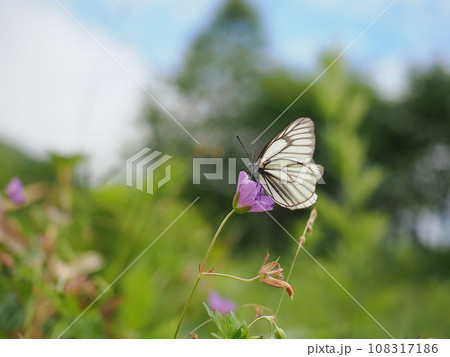 北海道の昆虫 花に止まろうとする エゾスジグロシロチョウ 夏型
