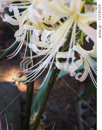 白いヒガンバナの花のクローズアップ(庭の片隅に咲いた白花曼殊沙華)
