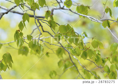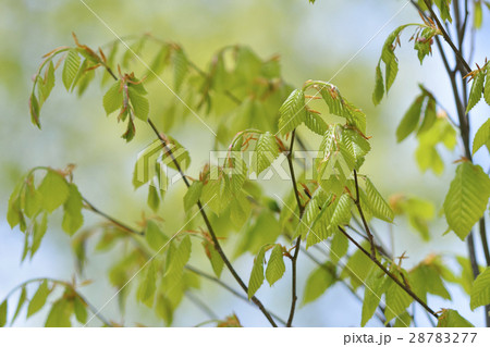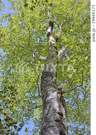 自然 植物 ブナ、森の王様。まっすぐ伸びた白い幹の先に瑞々しい若葉が茂る