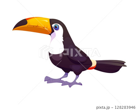 Cartoon Mexican toucan bird with a large yellow beak, black feathers, white chest, and expressive blue eyes. Isolated vector jungle forest or tropical avian creature living in jungle or rainforest