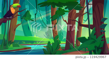 Toucan poster. Jungle forest on background. Tropical bird, wildlife parrot. Cute doodle leaf. Summer print. Drawing image with texture. Rainforest Vector cartoon flat style isolated illustration
