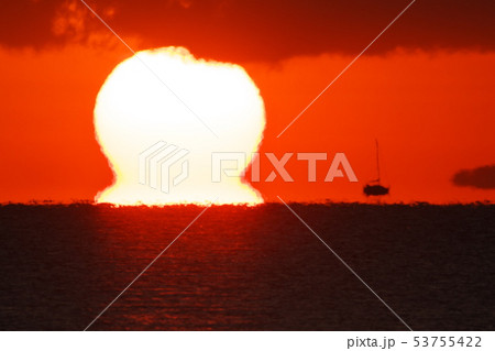 初日とヨットと蜃気楼により空中に浮かぶ島