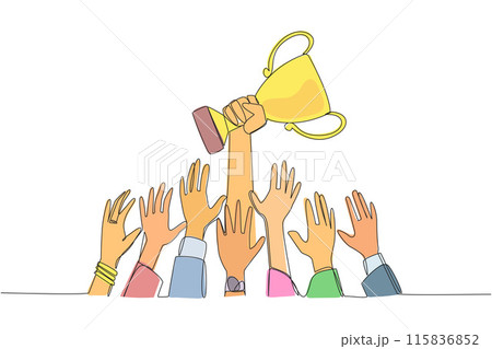 Continuous one line drawing hands fighting for the trophy. Ambition strives for worthy business success. Everyone can get it. Hard work is the difference. Single line draw design vector illustration