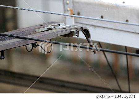 電車のパンタグラフと架線の張力調整装置(テンションバランサー)