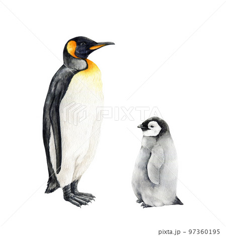 Emperor penguin bird with a baby set. Watercolor illustration. Hand drawn cute little penguin with a parent. Antarctica wildlife bird. Couple of beautiful penguins. Isolated on white background