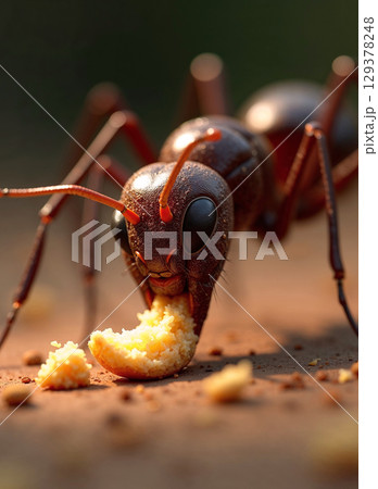An extreme macro photograph capturing a single ant in incredible detail. The sharp focus reveals the intricate textures of the insect's body as it feeds in a studio setting.