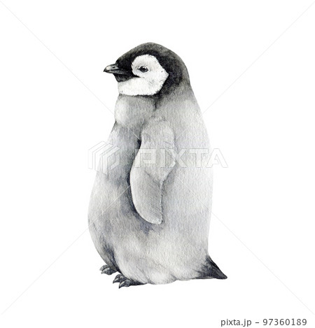 Baby penguin watercolor illustration. Hand drawn realistic cute fluffy emperor penguin nestling. Aptenodytes forsteri Antarctica avian. Baby penguin isolated on white background
