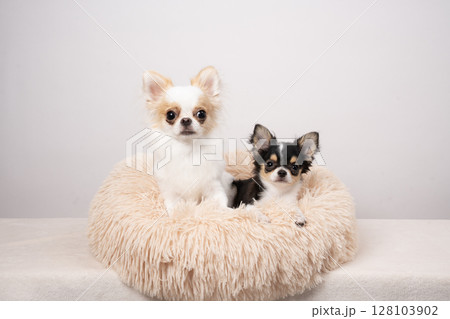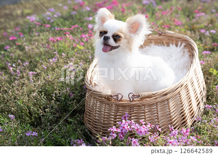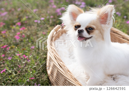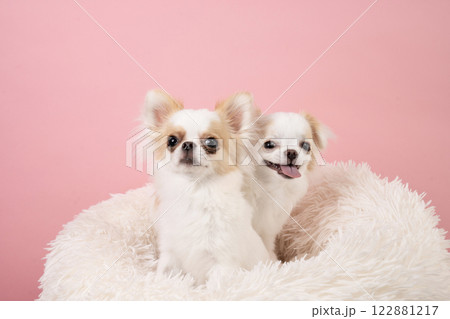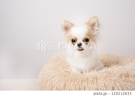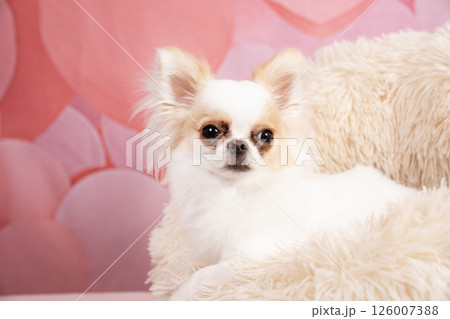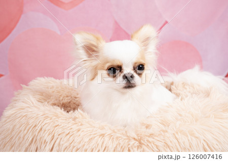 ピンクバックと白いベッドに入ったチワワのシンバ