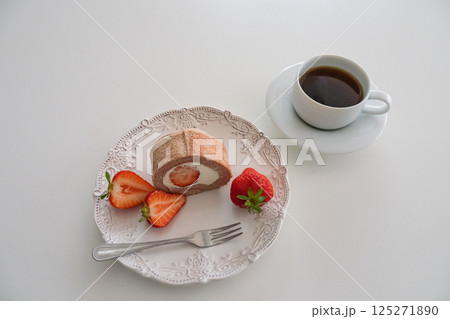 春の苺ロールケーキとコーヒーのティータイム(おしゃれな白い食器とともに)