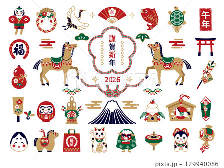 2026年の午年の年賀状テンプレート。ベクターイラスト。(馬、馬年)