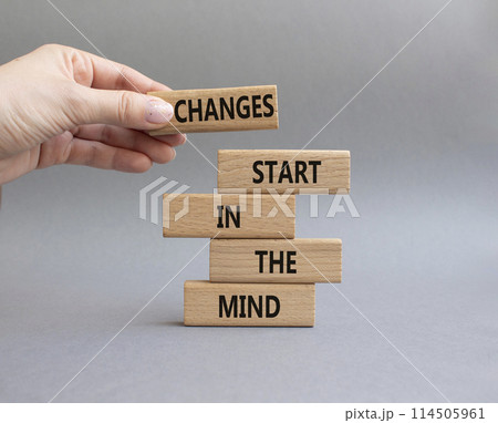 Changes start in the Mind symbol. Wooden blocks with words Changes start in the Mind. Beautiful grey background. Businessman hand. Business and Changes start in the Mind concept. Copy space.