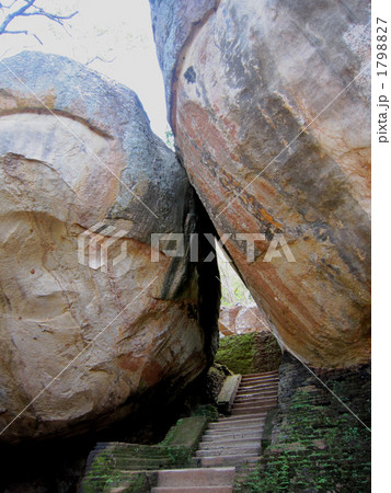 シーギリヤ・ロックの中腹の回廊、左の巨石の上は会議堂