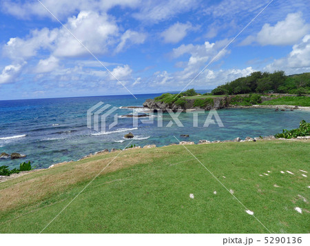 爽やかな南国の青空とサンゴが映える海が見えるリゾートゴルフ場の海越えホール(沖縄県宮古島市)