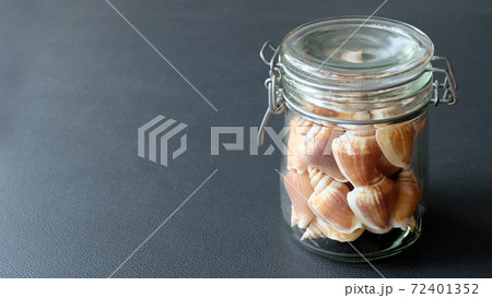 A glass jar full of the shell of dog conch, a species of edible sea snail.
