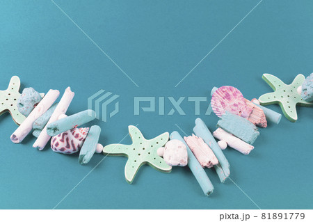 Necklace of sea shells and sea stars on blue background. Summer and holiday concept.