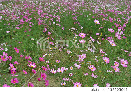 秋空の下に広がる色鮮やかな花びらと幻想的な光に包まれた満開のコスモス畑