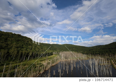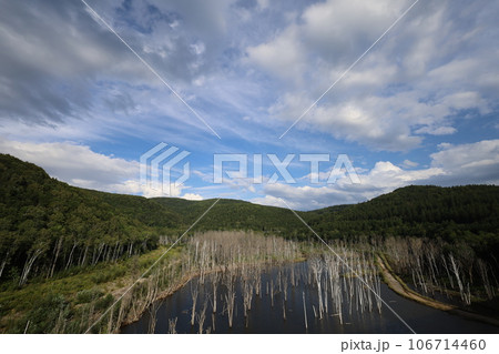 北海道の道北、八月の爽やかなドライブでみつけた森林の町、下川町、サンルダムに流れるサンル川の沈林