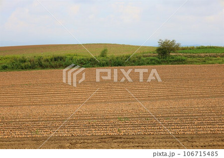 北海道、パッチワークの丘の町美瑛、玉ねぎの収穫が進む九月初旬の頃、菜の花畑と美瑛の丘