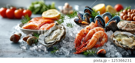 Panoramic view of fresh seafood with shrimp, oysters, mussels, and fish on ice garnished with lemons and herbs