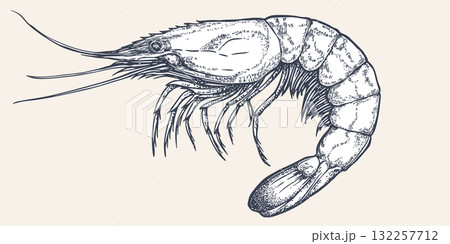 Shrimp, seafood, sketch. Vintage print, seafood shrimp prawn sketch, ink pencil drawing prawn, engrave sketch, hand drawn prawn. Tag packaging, label product. artwork shrimp. Vector Illustration
