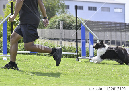 指示するハンドラーとダッシュするシェルティ ドッグアジリティ ドッグスクール ドッグスポーツ