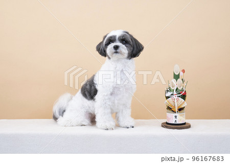 門松とお座りして微笑むミックス犬