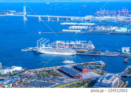 日本の横浜都市景観 あかいくつやダイヤモンド・プリンセスなどを望む。(オイローパ2が初入港)