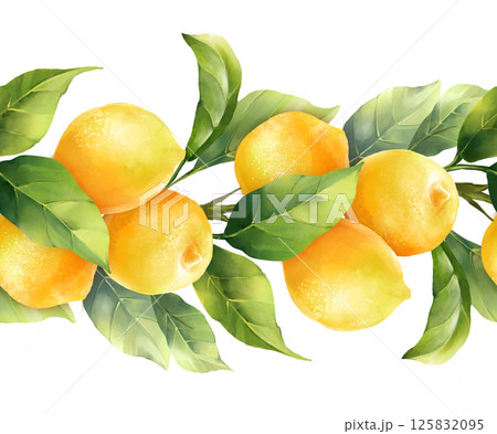 Seamless pattern featuring a garland of vibrant watercolor lemons with lush green leaves, perfect for fresh, summery designs.