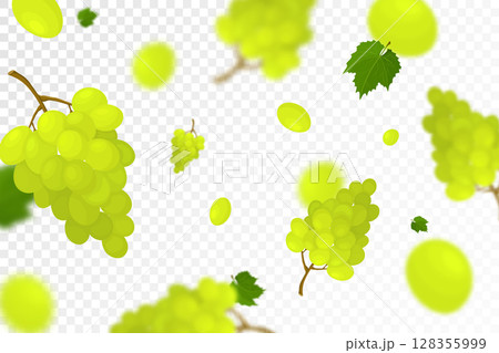 Falling juicy ripe grape with green leaves isolated on transparent background. Flying bunches of grapes with defocused blur effect. Can be used for wallpaper, banner, poster, print. Vector flat design