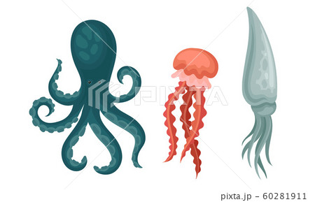 Collection of Sea or Ocean Creatures, Octopus, Squid, Jellyfish Aquatic Animals Vector Illustration