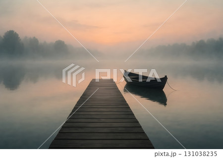 Solitary rowboat tethered beside a wooden pier on a calm foggy lake at dawn, soft mist