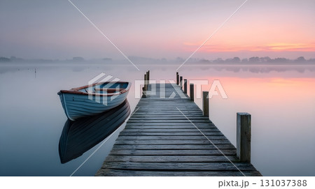 Calm sunrise over a misty lake with a wooden pier and a moored rowboat.
