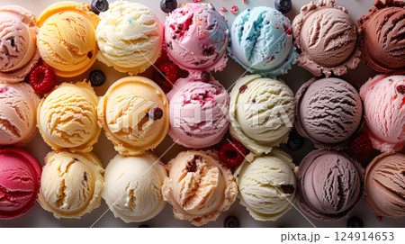 A colorful assortment of various ice cream scoops is artfully arranged on a white background.