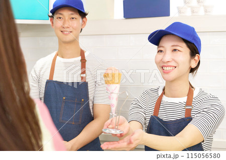 お客にメニューを見せるアイスクリーム店の販売スタッフ