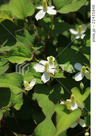 春の庭に咲くドクダミの白い萼に黄色い花穂の様子