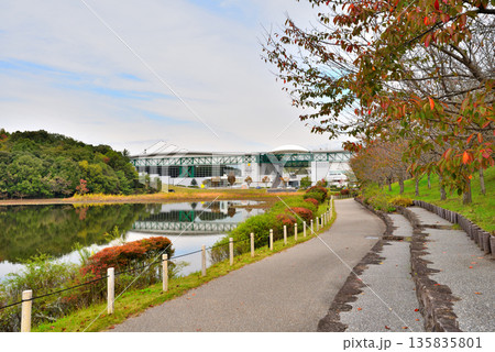 ジブリの大倉庫、エレベーター塔とリニモ 秋晴れの爽やかな風景
