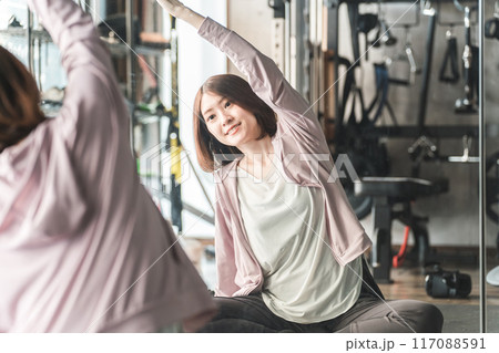 スポーツジムでストレッチ・柔軟体操する若いアジア人女性