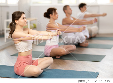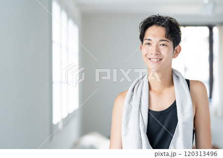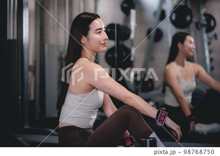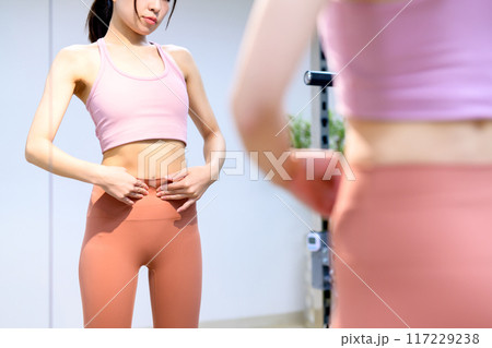 スポーツジムでお腹を気にする若い女性 ダイエット パーソナルジム 筋トレ女子