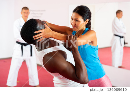 Girl paired up with woman to perform effective impact on pain points while learning self-defense.
