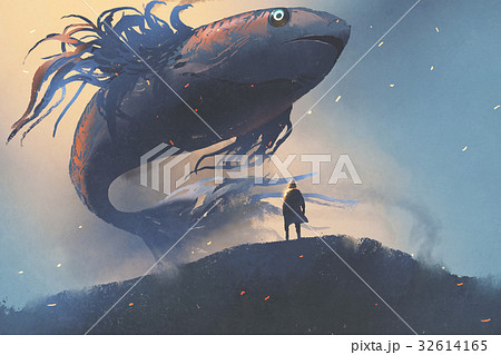 giant fish floating in the sky above man in cloak