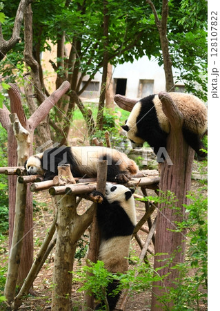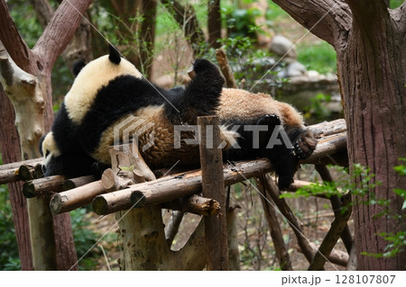 高所にあるウッドデッキでじゃれる青年パンダたち