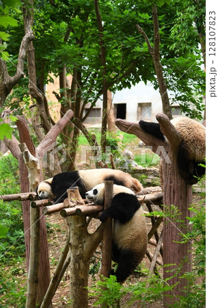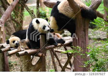 高所にあるウッドデッキでくつろぐ青年パンダたち