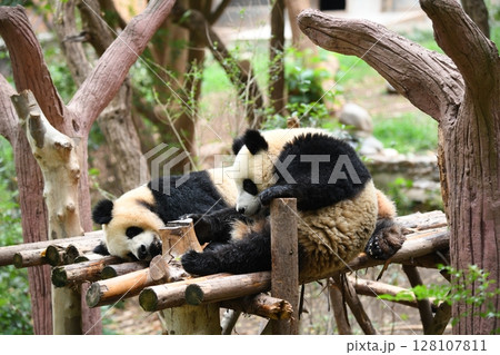 高所にあるウッドデッキでくつろぐ青年パンダたち