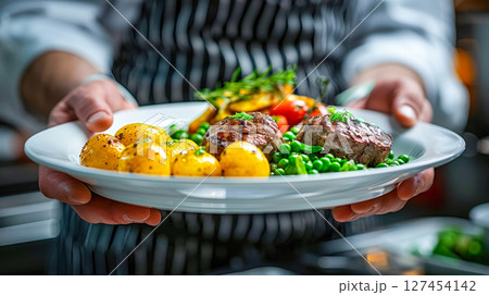 Chef presenting gourmet dish with potatoes, green peas, and grilled vegetables on a white plate
