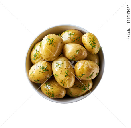 boiled new potatoes with fresh dill in a white bowl isolated on a white background. Top view.