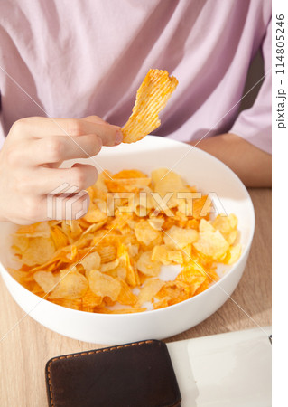 Caucasian person in pink t-shirt holding plate full of potato chips and preparing to eat