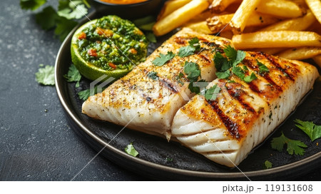 Grilled fish fillet served with crispy fries and fresh green sauce on a dark plate