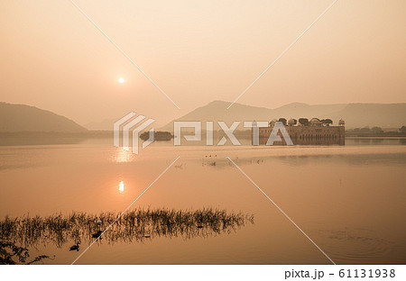 インド 夕暮れ時のジャイプルのマン・サガー湖に浮かぶ水の宮殿ジャル・マハル